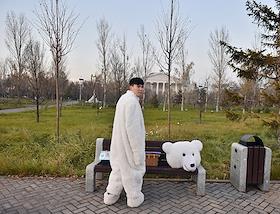 Виды Астаны. Жанровая фотография. Молодой человек в костюме белого медведя в парке.