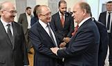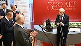 Торжественная церемония открытия выставки "Санкт-Петербургский государственный университет: 300 лет служения Отечеству" в Государственной думе (ГД) России. Ректор Санкт-Петербургского государственного университета (СПбГУ) Николай Кропачев (слева), лидер КПРФ, руководитель фракции КПРФ в ГД России Геннадий Зюганов (второй справа) и член комитета ГД России по финансовому рынку Вячеслав Макаров (в центре) во время церемонии.