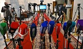 Пленарное заседание Государственной думы (ГД) России. Жанровая фотография. Микрофоны средств массовых коммуникаций.