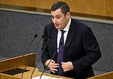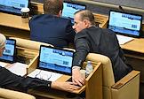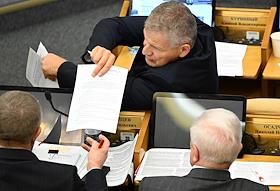 Пленарное заседание Государственной думы (ГД) России. Член комитета ГД России по транспорту и развитию транспортной инфраструктуры Сергей Веремеенко (справа) во время заседания.