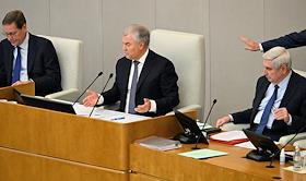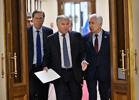 Пленарное заседание Государственной думы (ГД) России. Слева направо: первый заместитель председателя ГД России Александр Жуков, председатель ГД России Вячеслав Володин и руководитель фракции партии "Единая Россия" в ГД России Владимир Васильев во время заседания.
