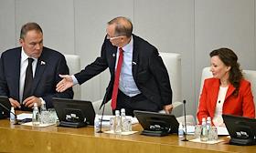 Пленарное заседание Государственной думы (ГД) России. Слева направо: заместитель председателя ГД России Петр Толстой, первый заместитель председателя комитета ГД России по развитию гражданского общества, вопросам общественных и религиозных объединений Николай Бурляев и заместитель председателя ГД России Анна Кузнецова во время заседания.