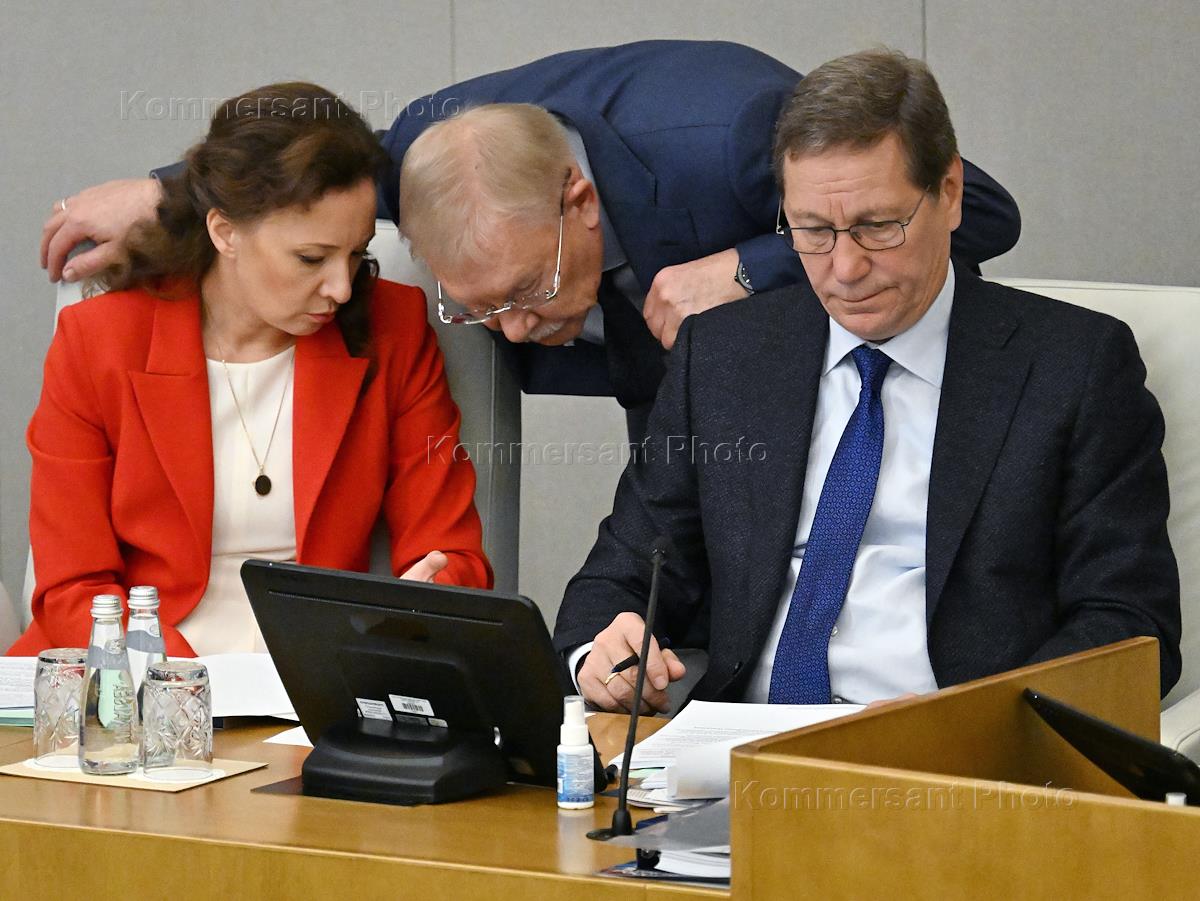 Пленарное заседание Государственной думы (ГД) России. Слева направо: заместитель председателя ГД России Анна Кузнецова, председатель комитета ГД России по контролю Олег Морозов и первый заместитель председателя ГД России Александр Жуков во время заседания.