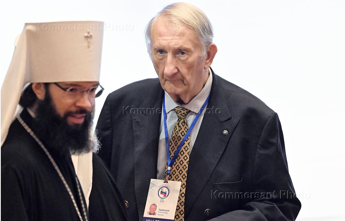 VIII Всемирный конгресс соотечественников, проживающих за рубежом, под лозунгом "Вместе с Россией", в зале Церковных Соборов храма Христа Спасителя. Председатель Общества памяти Императорской гвардии Александр Трубецкой (справа) и митрополит Волоколамский, викарий Патриарха Московского и всея Руси Антоний (слева) во время конгресса.