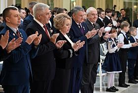 XI Торжественная церемония награждения детей и подростков, проявивших мужество в экстремальных ситуациях и спасших человеческие жизни, в Совете Федерации (СФ) России. Председатель СФ России Валентина Матвиенко (вторая слева) на церемонии.