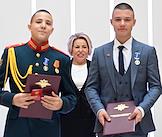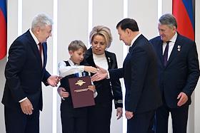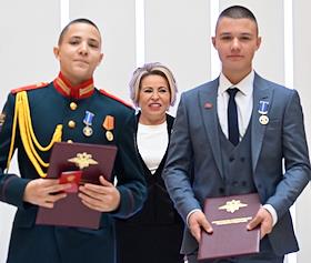XI Торжественная церемония награждения детей и подростков, проявивших мужество в экстремальных ситуациях и спасших человеческие жизни, в Совете Федерации (СФ) России. Председатель СФ России Валентина Матвиенко (в центре), участники церемонии из Оренбургской области Иван Фоменко (слева) и Максим Уренков (справа) на церемонии.