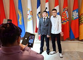 XI Торжественная церемония награждения детей и подростков, проявивших мужество в экстремальных ситуациях и спасших человеческие жизни, в Совете Федерации (СФ) России. Дети: Николай Цветков из Ленинградской области (слева) и Илья Гайдук из Орловской области после окончания церемонии.