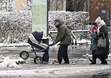 Жанровая фотография. Снегопад в городе. Папа с детской коляской на улице во время снегопада.