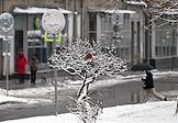 Жанровая фотография. Снегопад в городе. Женщина разговаривает по мобильному телефону во время снегопада.