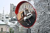Жанровая фотография. Снегопад в городе. Отражение автомобиля в сферическом обзорном зеркале.