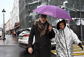 Жанровая фотография. Снегопад в городе. Женщина и мужчина идут под зонтом во время снегопада.