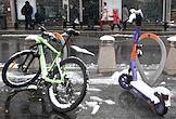 Жанровая фотография. Снегопад в городе. Велосипед и электросамокат на обочине тротуара.