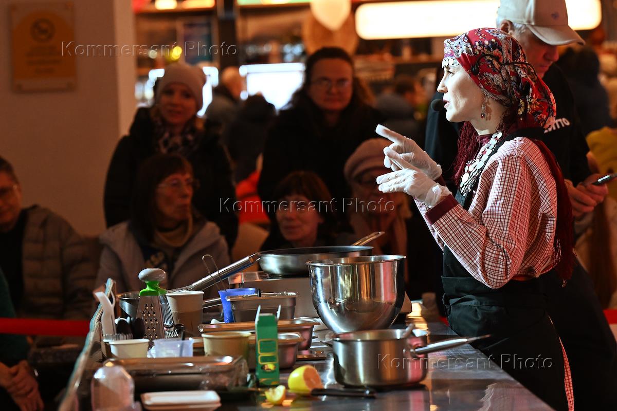 День народного единства и День рождение павильона "Дом российской кухни" на ВДНХ. Мастер-классы национальной кухни. Соосновательница сети удмуртской кухни "Перепечкин" Ирина Вотинцева во время мастер-класса.