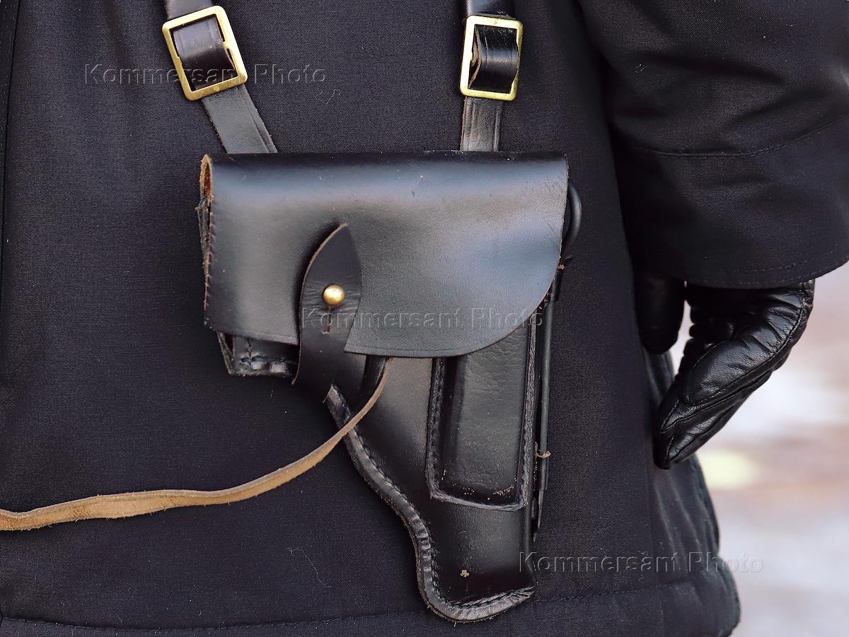 Церемония открытия выставки трофейной военной техники в музейно-историческом парке "Россия - Моя история". Жанровая фотография. Сотрудник полиции на территории выставки. Кобура служебного оружия.