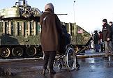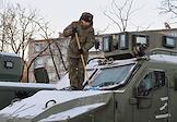 Церемония открытия выставки трофейной военной техники, прибывшей с харьковского и сумского направлений СВО, в музейно-историческом парке "Россия - Моя история". Очистка от снега образцов боевой техники. Жанровая фотография.