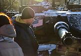 Церемония открытия выставки трофейной военной техники, прибывшей с харьковского и сумского направлений СВО, в музейно-историческом парке "Россия - Моя история". Посетители на выставке возле трофейного танка М1 "Абрамс" производства США. Жанровая фотография.