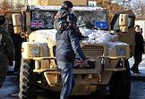 Церемония открытия выставки трофейной военной техники, прибывшей с харьковского и сумского направлений СВО, в музейно-историческом парке "Россия - Моя история". Жанровая фотография. Сотрудник полиции на территории выставки.
