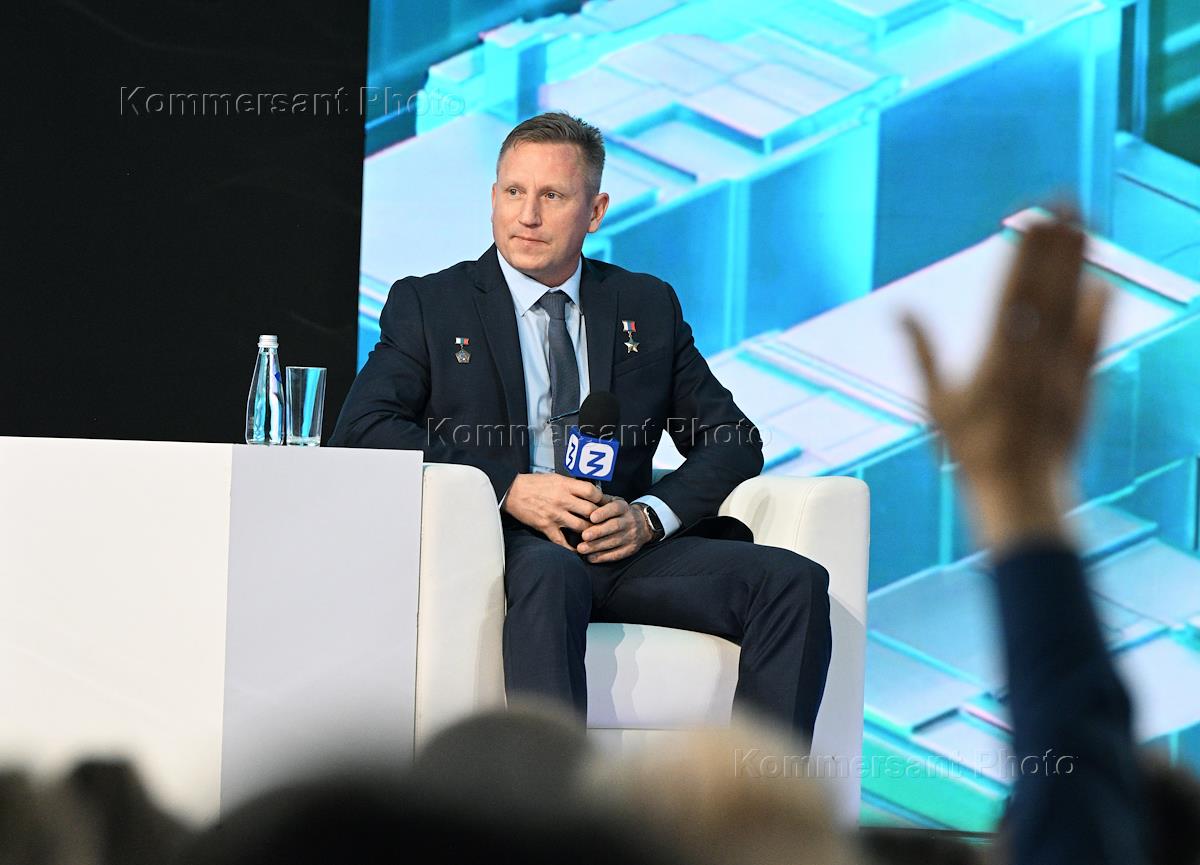 Федеральный просветительский марафон "Знание.Первые" в Музейно-выставочном объединении "Манеж". Космонавт-испытатель отряда космонавтов "Роскосмоса" Сергей Прокопьев во время открытого диалога на тему: "Вселенная возможностей: путь в космическую отрасль".