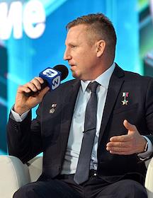 Федеральный просветительский марафон "Знание.Первые" в Музейно-выставочном объединении "Манеж". Военный корреспондент ВГТРК Андрей Руденко во время открытого диалога на тему: "Подвиги во имя будущего".