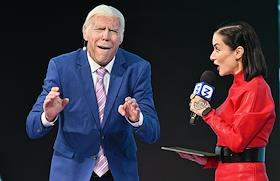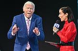 Федеральный просветительский марафон "Знание.Первые" в Музейно-выставочном объединении "Манеж". Актер Дмитрий Дюжев в образе президента США Джо Байдена - героя фильма "Гудбай" (слева) и директор телеканала ТНТ, заместитель генерального директора холдинга "Газпром-медиа" Тинатин Канделаки (справа) во время открытого диалога на тему: "Создай себя – создай будущее".