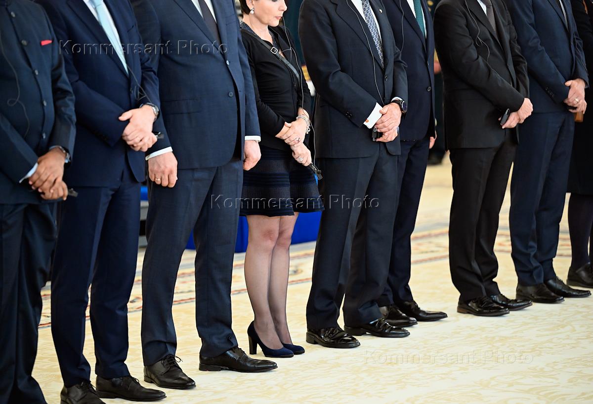 Церемония вручения верительных грамот вновь прибывшими послами иностранных государств президенту России Владимиру Путину в Александровском зале Большого Кремлевского дворца. Слева направо: посол Киргизии в России Кубанычбек Боконтаев, посол Италии в России Чечилия Пиччони, посол Албании в России Генц Пецани, посол Зимбабве в России Марк Грей Маронгве, посол Эфиопии в Генет Тешоме Жирру, посол Боснии и Герцеговины в России Иван Орлич, посол Кении в России Питер Мутуку Матуки и посол Лаоса в России Сипхандон Ойбуабудди перед началом церемонии.