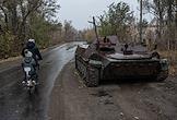 Виды Авдеевки. Разбитый ржавый БТР на дороге в городе.