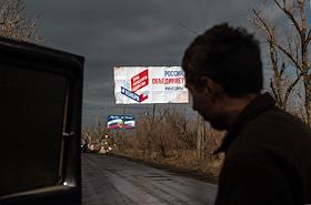 Виды Авдеевки. Рекламный плакат с надписью "Россия объединяет!" на дороге города.