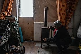 Виды Авдеевки. Женщина растапливает печь "буржуйку" в своей квартире.
