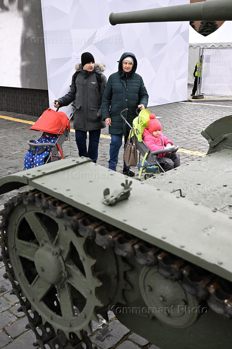Интерактивный музей под открытым небом в честь 83-й годовщины исторического военного парада на Красной площади. Экспонат музея "Сталинец". Посетители музея.