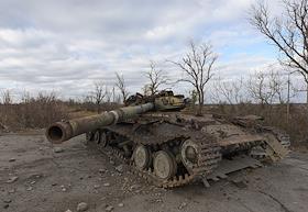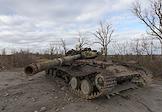 Трасса "Донецк - Пески". Жанровая фотография. Разбитый украинский танк на дороге.