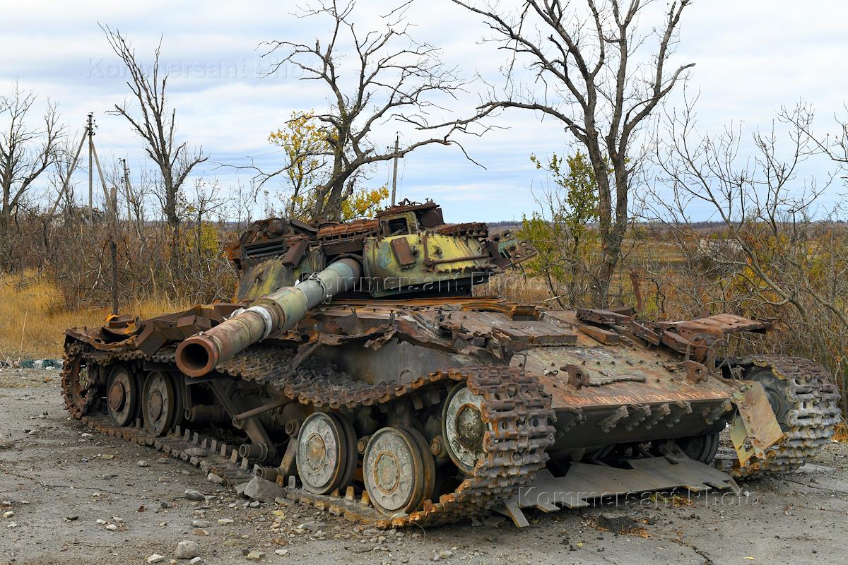 Трасса "Донецк - Пески". Жанровая фотография. Разбитый украинский танк на дороге.