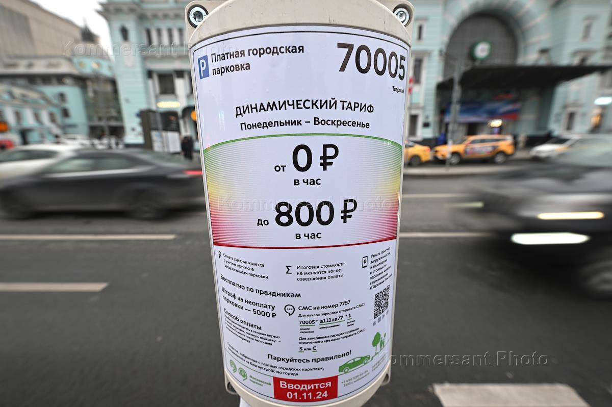 Genre photography. Paid parking on Pyatnitskaya Street. Parking rates range from 100 to 1000 rubles per hour.