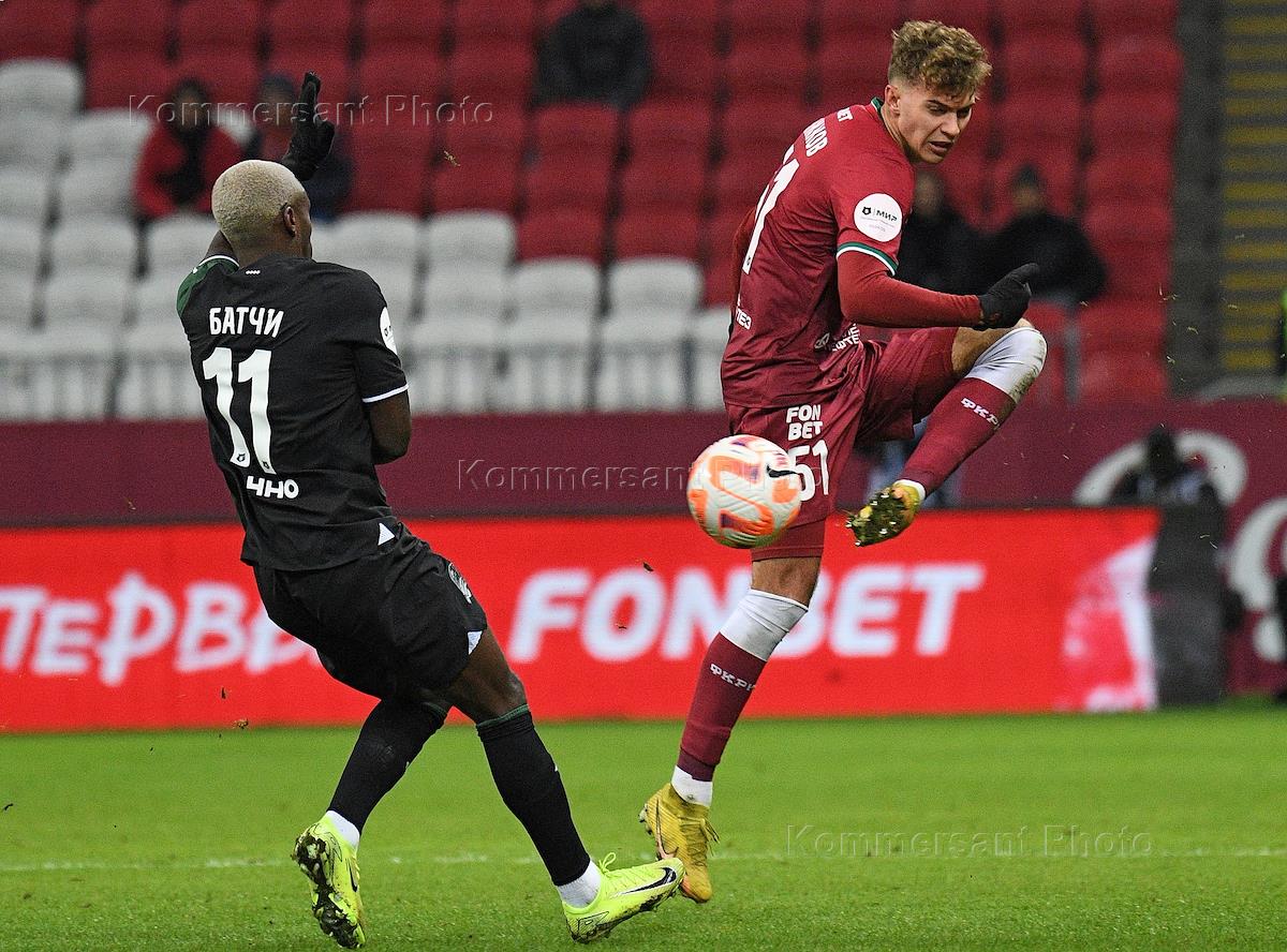 Мир Российская Премьер-Лига (РПЛ) 2024/2025. 15-й тур. Матч между командами "Рубин" (Казань) – "Краснодар" (Краснодар) на стадионе "Ак Барс Арена". Игрок команды "Рубин" Илья Рожков (справа) и игрок команды "Краснодар" Жоау Батчи (слева) во время матча.