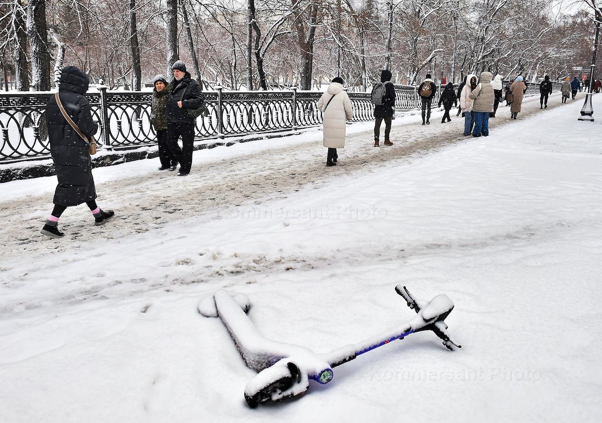 Виды Новосибирска. Жанровая фотография. Первый снег в городе. Заснеженный самокат.