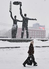 Виды Новосибирска. Жанровая фотография. Первый снег в городе. Фрагмент памятника вождю революции Владимиру Ленину "Рабочий и колхозница" на площади Ленина.