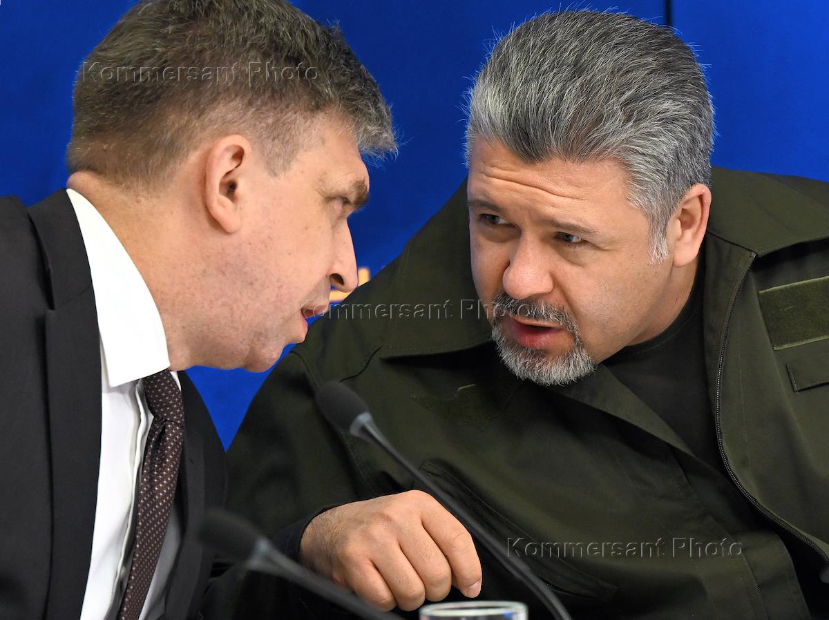 Пресс-конференция на тему: "Преступления киевского неонацистского режима в Угледаре" в МИА "Россия сегодня". Заместитель руководителя рабочего аппарата Уполномоченного по правам человека в России Сергей Футо (слева) и член Общественной палаты России Максим Григорьев во время пресс-конференции.