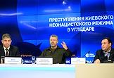 Пресс-конференция на тему: "Преступления киевского неонацистского режима в Угледаре" в МИА "Россия сегодня". Слева направо: заместитель руководителя рабочего аппарата Уполномоченного по правам человека в России Сергей Футо, член Общественной палаты России Максим Григорьев и член Совета при президенте России по развитию гражданского общества и правам человека Александр Брод во время пресс-конференции.