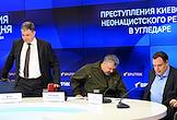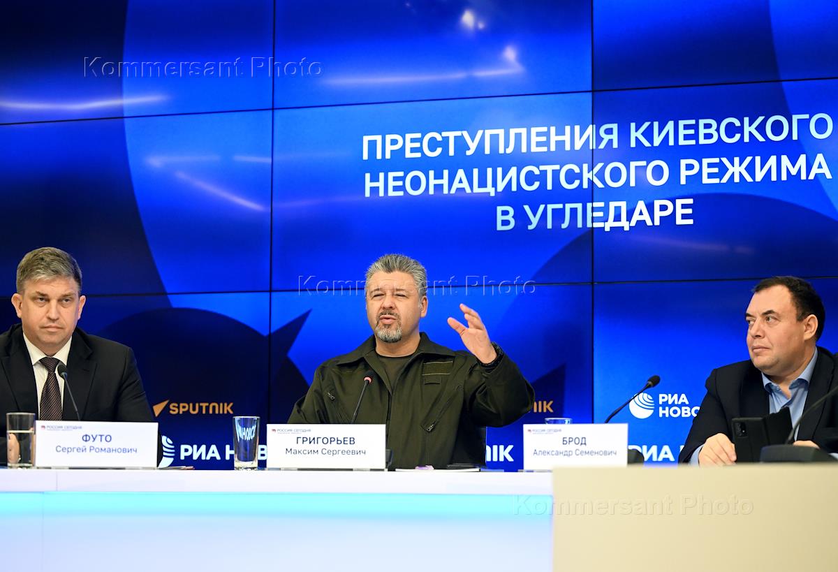 Пресс-конференция на тему: "Преступления киевского неонацистского режима в Угледаре" в МИА "Россия сегодня". Слева направо: заместитель руководителя рабочего аппарата Уполномоченного по правам человека в России Сергей Футо, член Общественной палаты России Максим Григорьев и член Совета при президенте России по развитию гражданского общества и правам человека Александр Брод во время пресс-конференции.
