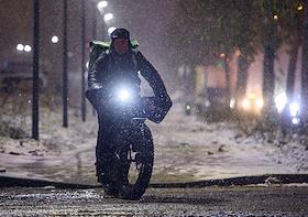 Views of Kazan during snowfall. Genre photography. Food delivery courier on a bicycle.