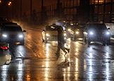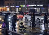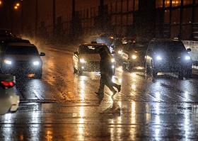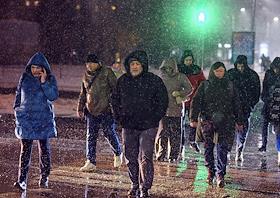 Views of Kazan during snowfall. Genre photography. Pedestrians while crossing the roadway.