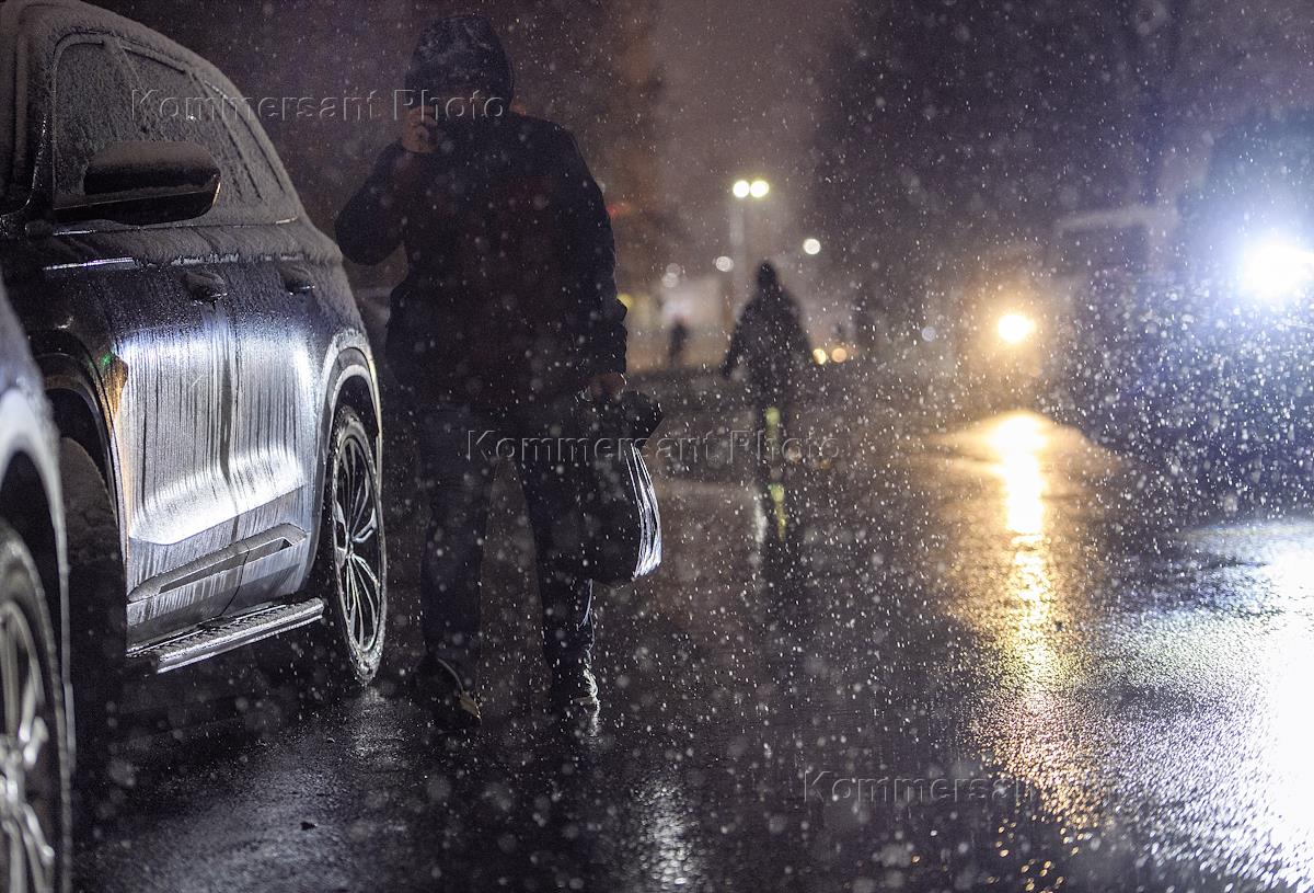 Views of Kazan during snowfall. Genre photography. Pedestrians while crossing the roadway.