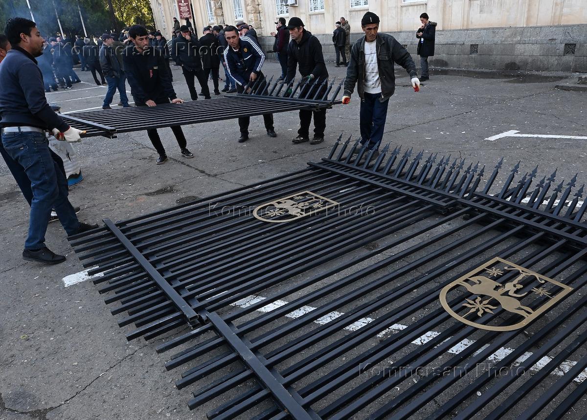 Ситуация в Абхазии. Сторонники оппозиции срезают сломанный ранее железный забор у здания Парламента Абхазии.