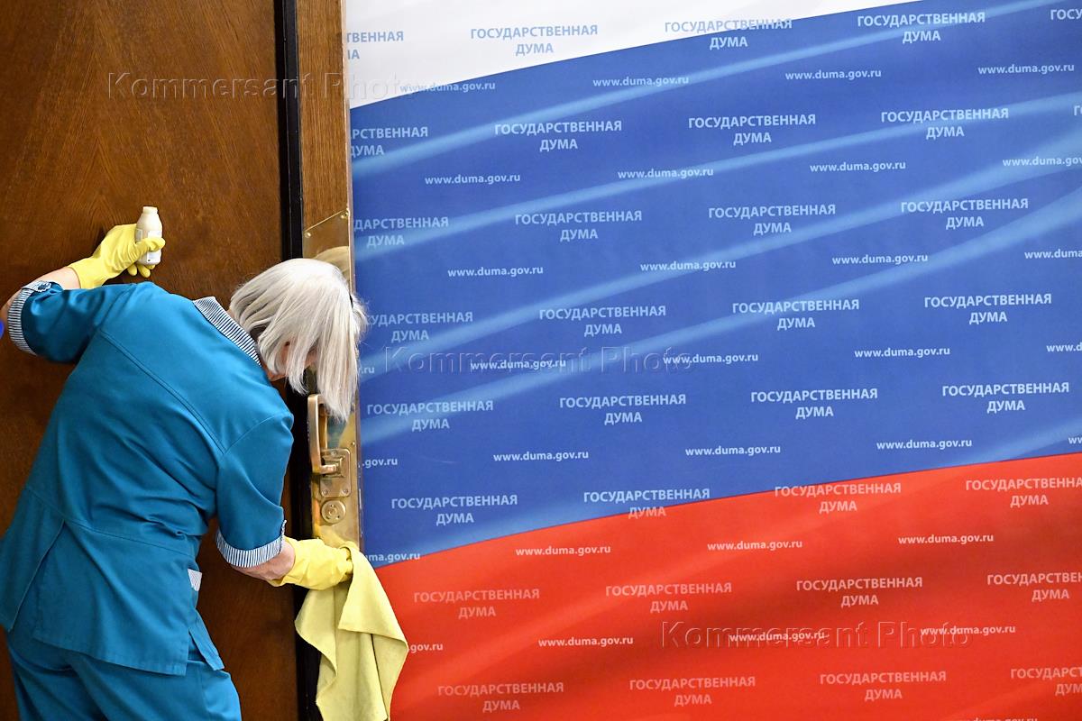 Заседание рабочей группы по вопросам совершенствования законодательства в сфере информационного бизнеса и блогосферы в Государственной думе (ГД) России. Жанровая фотография. Сотрудница клининговой компании во время уборки зала заседаний.