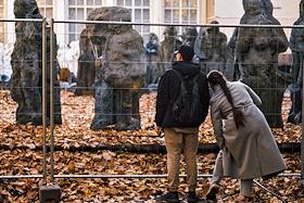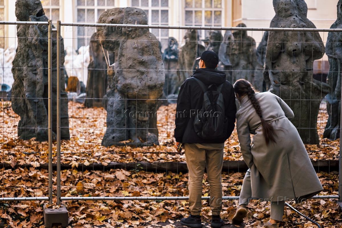 Жанровая фотография. Михайловский сад. Бракованные скульптуры. Прохожие смотрят на скульптуры.