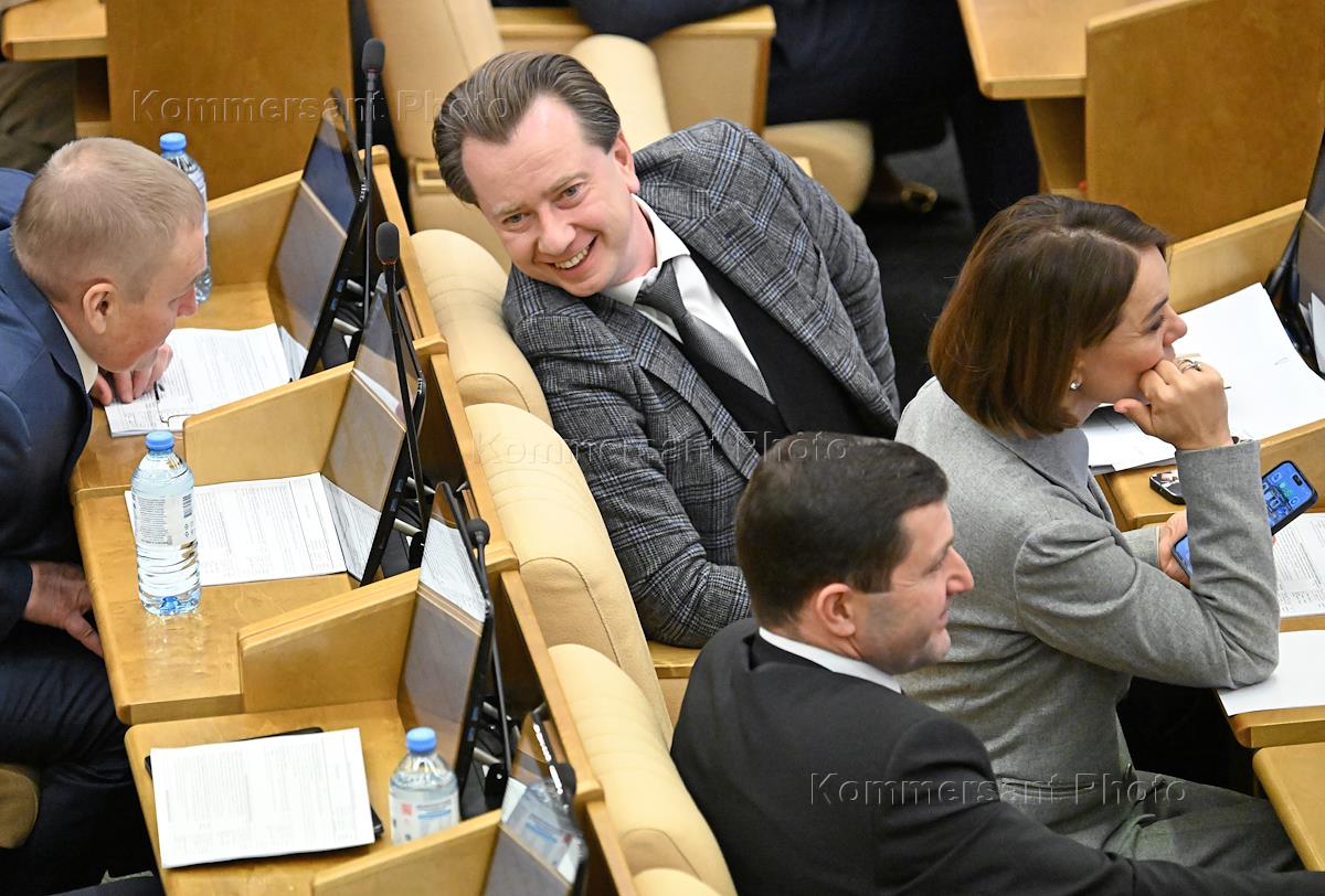 Пленарное заседание Государственной думы (ГД) России. Первый заместитель председателя комитета ГД России по экологии, природным ресурсам и охране окружающей среды Владимир Бурматов (в центре) во время заседания.