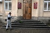 Виды Абхазии. Жанровая фотография. Уборщик сметает мусор с лестницы здания Администрации президента Республики Абхазии.