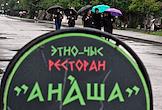 Жанровая фотография. Абхазские женщины в черной одежде идут под зонтами во время дождя по улице города. Вывеска этно-чык ресторана "Анаша".