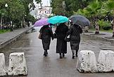 Жанровая фотография. Абхазские женщины в черной одежде идут под зонтами во время дождя по улице города.