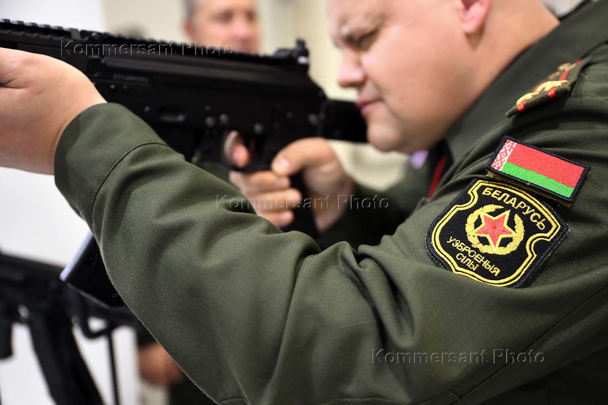 XXVIII Международная выставка средств обеспечения безопасности государства "ИНТЕРПОЛИТЕХ" в выставочном комплексе "Тимирязев центр". Жанровая фотография. Военнослужащие Министерства обороны Белоруссии на выставке.
