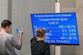Пленарное заседание Государственной думы (ГД) России. Жанровая фотография. Электронное табло с результатами голосования депутатов ГД России в холле здания.
